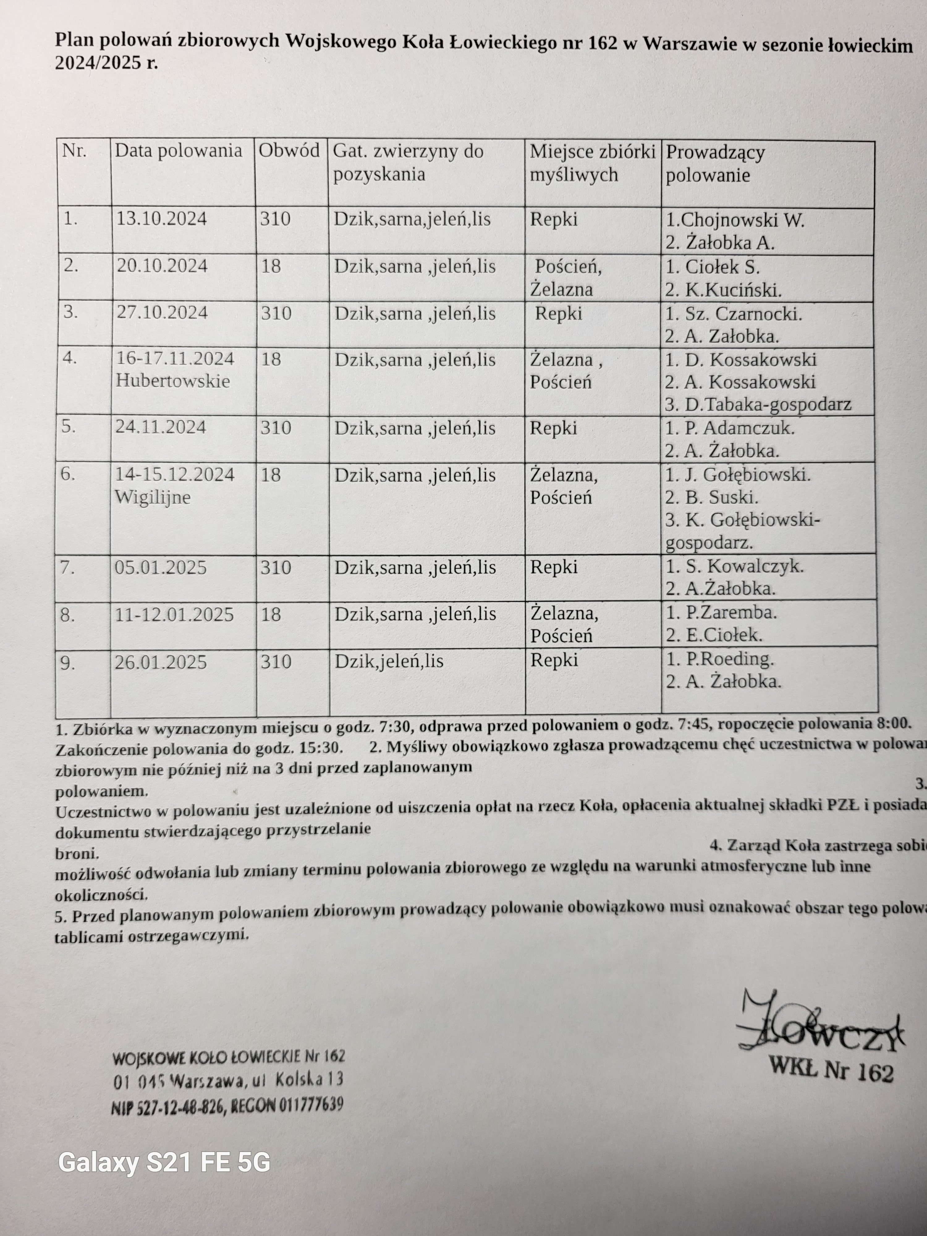 z 2023 r., poz. 1082) ) oraz art. 61 § 1 i § 4 ustawy z dnia 14 czerwca 1960 r. Kodeks Postępowania Administracyjnego (t. j. z dnia 15 kwietnia 2024 r. Dz. U. z 2024 r., poz. 572) podaje do publicznej wiadomości kalendarz polowań zbiorowych Wojskowego Koła Łowieckiego nr 162 w sezonie łowieckim 2024/2025.